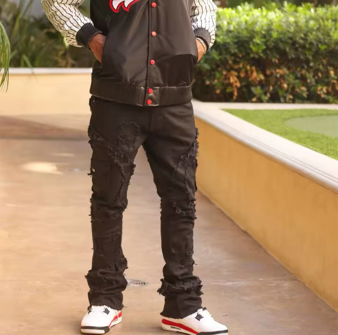 Mens Streetwear Distressed Flare Jeans Retro Patchwork Denim with Frayed Spiral Detailing