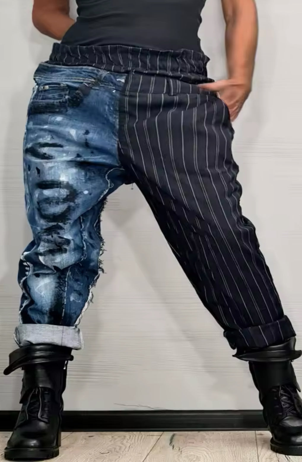 Introducing our new vogue style Plus Size Women's Pinstripe and Denim Split Jeans. Limited quantity available, so hurry and grab yours now! These trendy jeans are perfect for any occasion and will add a touch of style to your wardrobe. Made with high-quality materials for comfort and durability. Order now before they're gone! See size chart.
