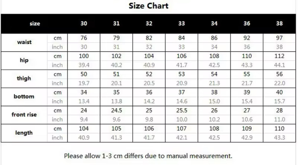 Sizes Available: 29 - 38 (Refer to the size chart for accurate measurements)